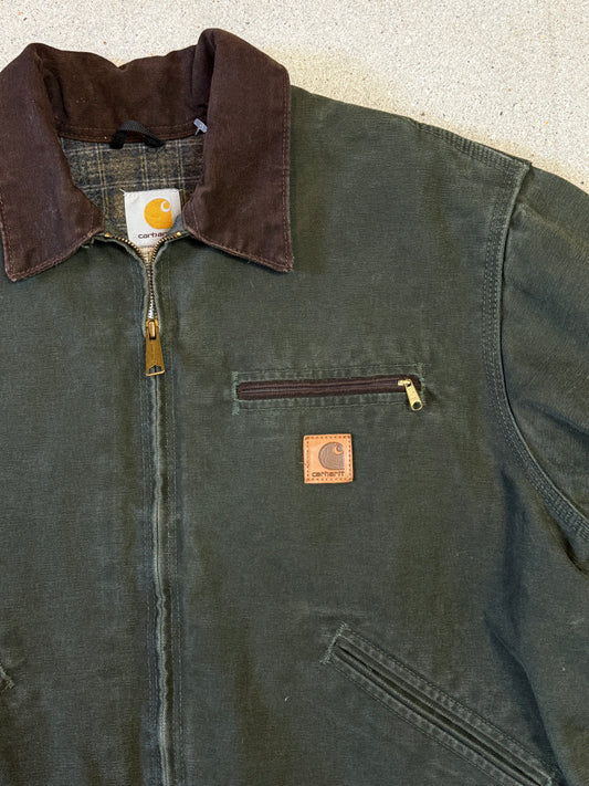 Rare 1990s Carhartt Detroit Jacket J97 MOS faded forest green / brown contrast collar (size L) (size Large regular)