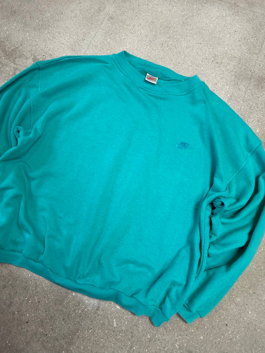 Early 90s Nike Made in Portugal Swoosh Logo Embroidery Boxy Sweatshirt Teal/Turquoise (Large)