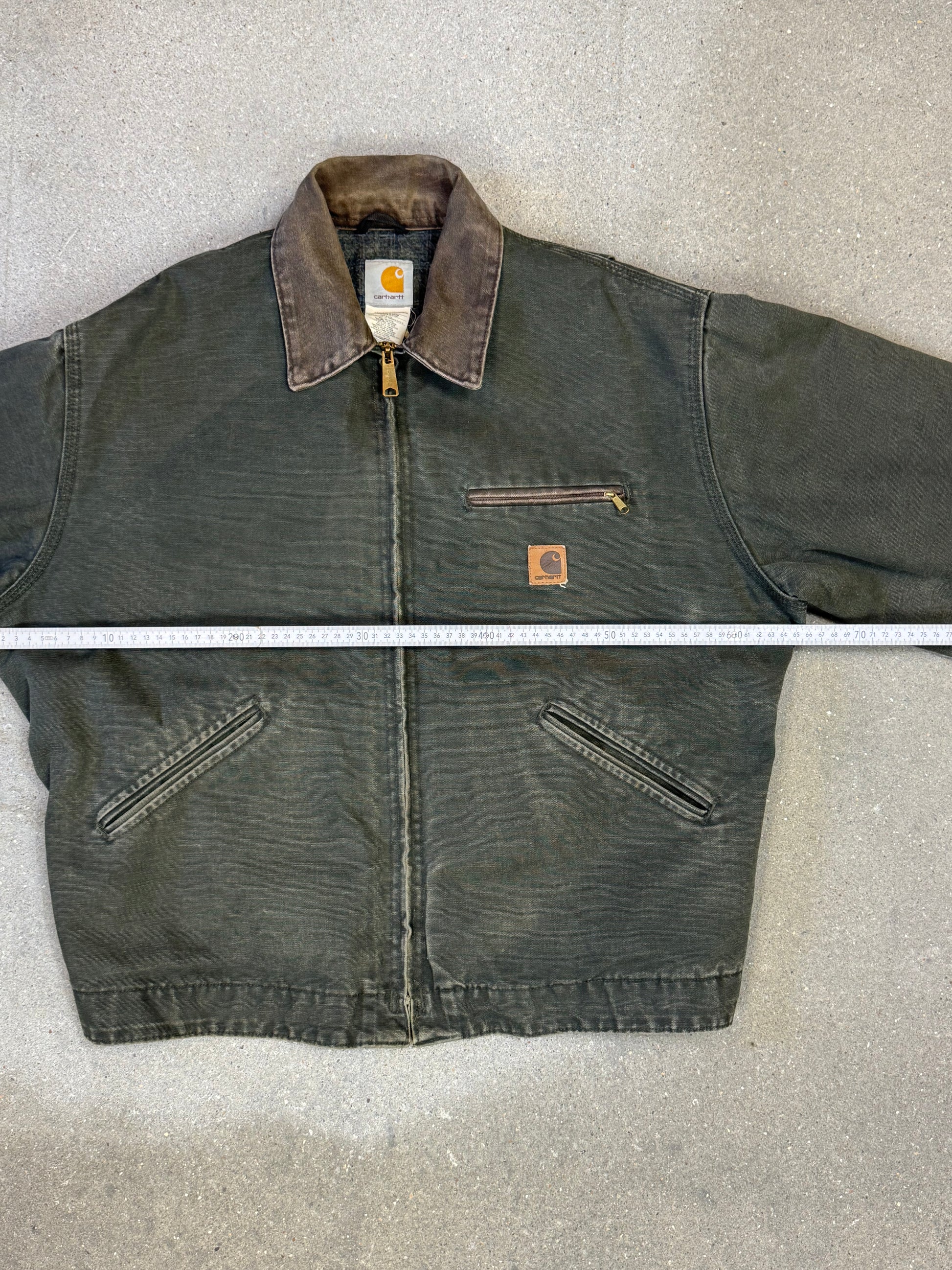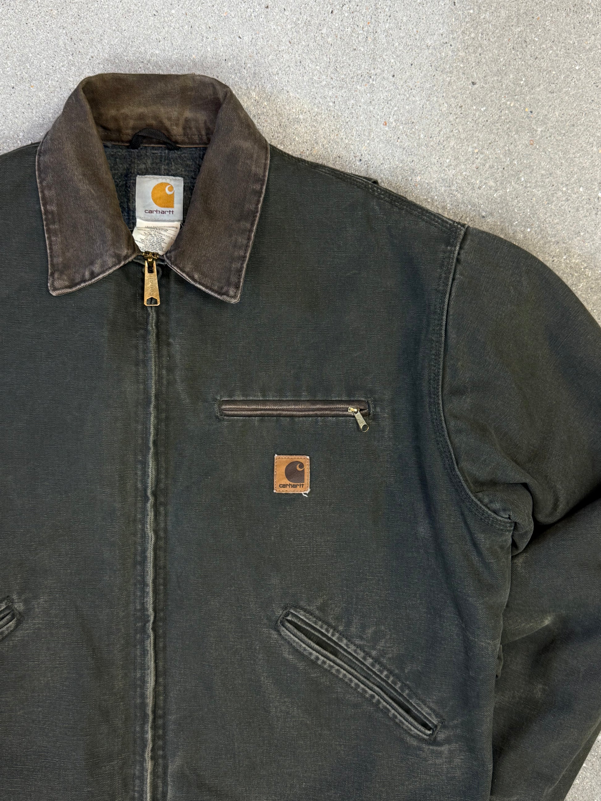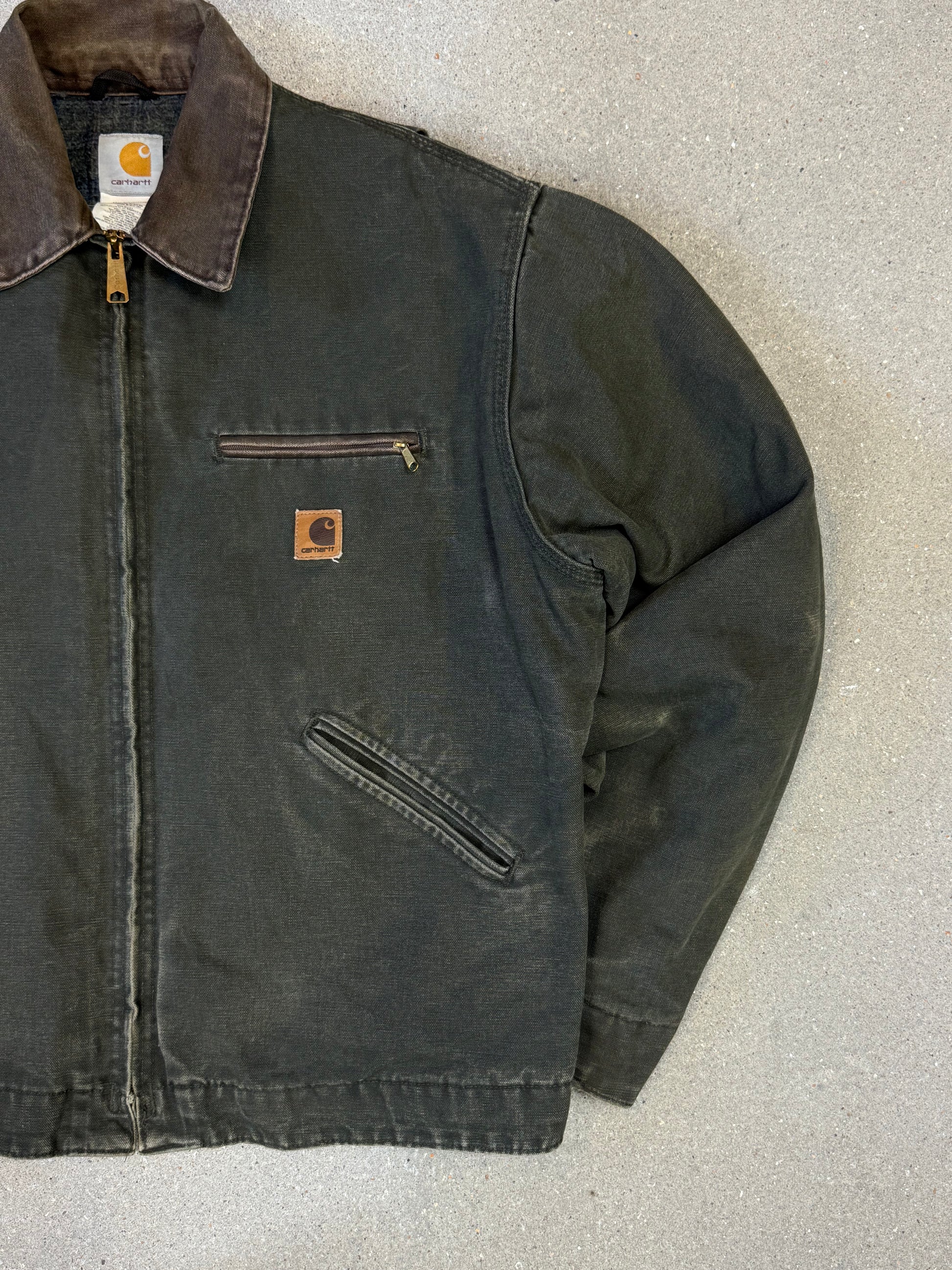 1990s Carhartt Detroit Jacket J97 MOS 'Made in USA' faded green / brown contrast collar (size L) (size Large regular)
